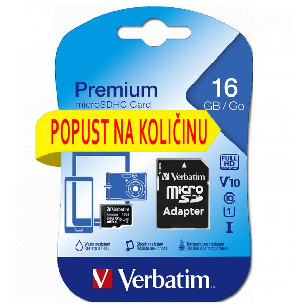 Kapacitet: 16GB Klasa: 10 Model: Premium Brzina čitanja: do 80MB/s Brzina pisanja: do 10MB/s Kompatibilnost: UHS-I U1, V10, A1 Dimenzije: 11 x 15 x 1mm Dimenzije adaptera: 24 x 32 x 2.1mm